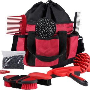 Harrison Howard Horse Grooming Kit 9-Piece Equine Care Series Horse Brush Sets with Organizer Tote Bag Tack Room Supplies Shedding Grooming Massaging Tools Red