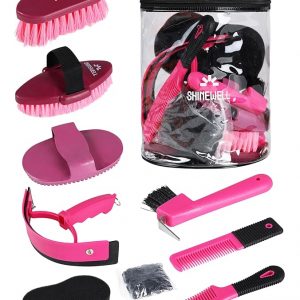 Shinewell Horse Grooming Brushes Kit 9 pieces with Organizer Bag Grooming Care Series Horse Brush Sets Pink