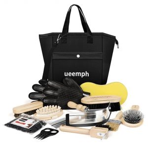 Horse Grooming Kit (12-Piece): Brushes, Storage Bag, Sweat Scraper, Mane Comb, Grooming Gloves, (Black)
