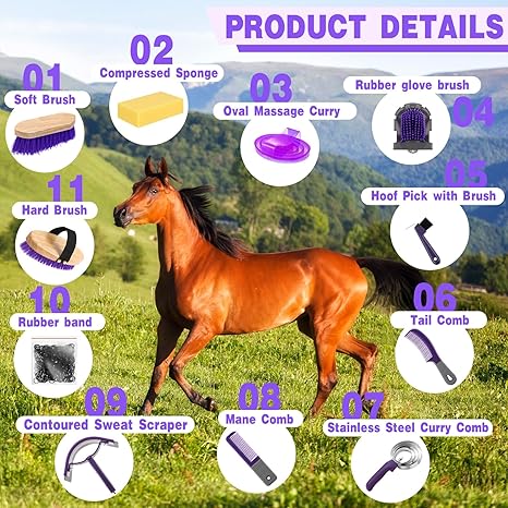 Abbylike 12 Pieces Horse Grooming Kit Racing Festival Tack Room Supplies Horse Brush Sets Equine Care Cleaning Kit Shedding Grooming Massaging Tools(Gray and Purple)