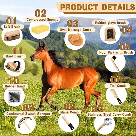 • Horse Grooming Kit: this horse grooming set includes storage bag, oval massage brush, hard brush, soft brush, sweat scraper, bath sponge, hoof pick with brush, mane comb, tail comb, rubber band, etc., a total of 12 pieces, such a nice and complete grooming set can satisfy your needs for grooming your horse