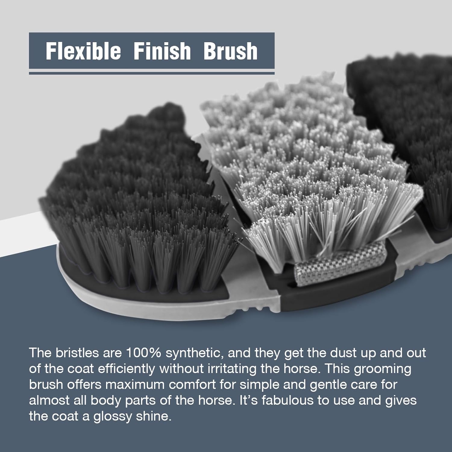 • Flexible: Two flexible joints allow the brush to bend and fit the contours of the horse’s body whilst flexing to fit the movement of your hand.
