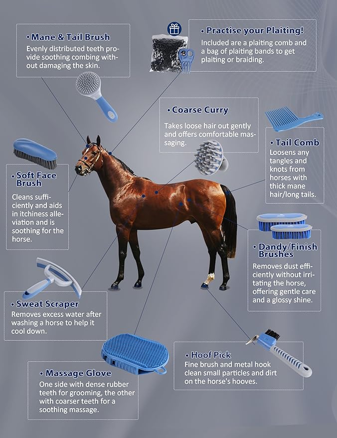 - Complete Grooming Kit: This horse grooming kit includes a variety of brushes to meet all your horse grooming needs. It contains a dandy brush, body brush, soft face brush, coarse curry, sweat scraper, hoof pick, tail comb, mane & tail brush, and massage glove, along with a pack of rubber bands for styling the mane and tail. The comprehensive set ensures thorough and detailed cleaning.