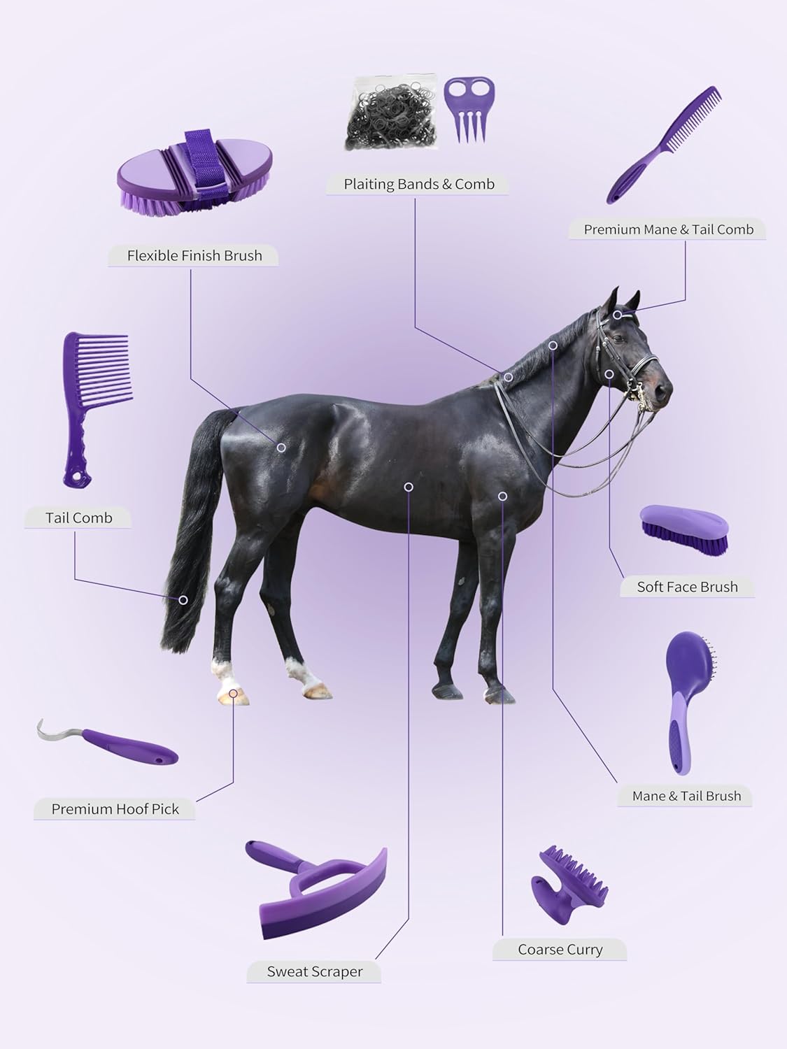 - FULL SET SOOTHING GROOMING KIT: This horse grooming set offers all the essential brushes and accessories you need, with a range of brushes for grooming from head to tail, and hooves for all the care and attention they need, making your grooming a lot more complete.