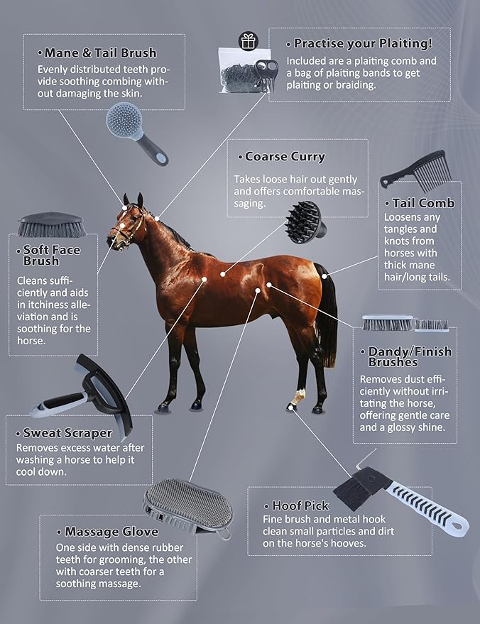 • Complete Grooming Kit: This horse grooming kit includes a variety of brushes to meet all your horse grooming needs. It contains a dandy brush, body brush, soft face brush, coarse curry, sweat scraper, hoof pick, tail comb, mane & tail brush, and massage glove, along with a pack of rubber bands for styling the mane and tail. The comprehensive set ensures thorough and detailed cleaning.