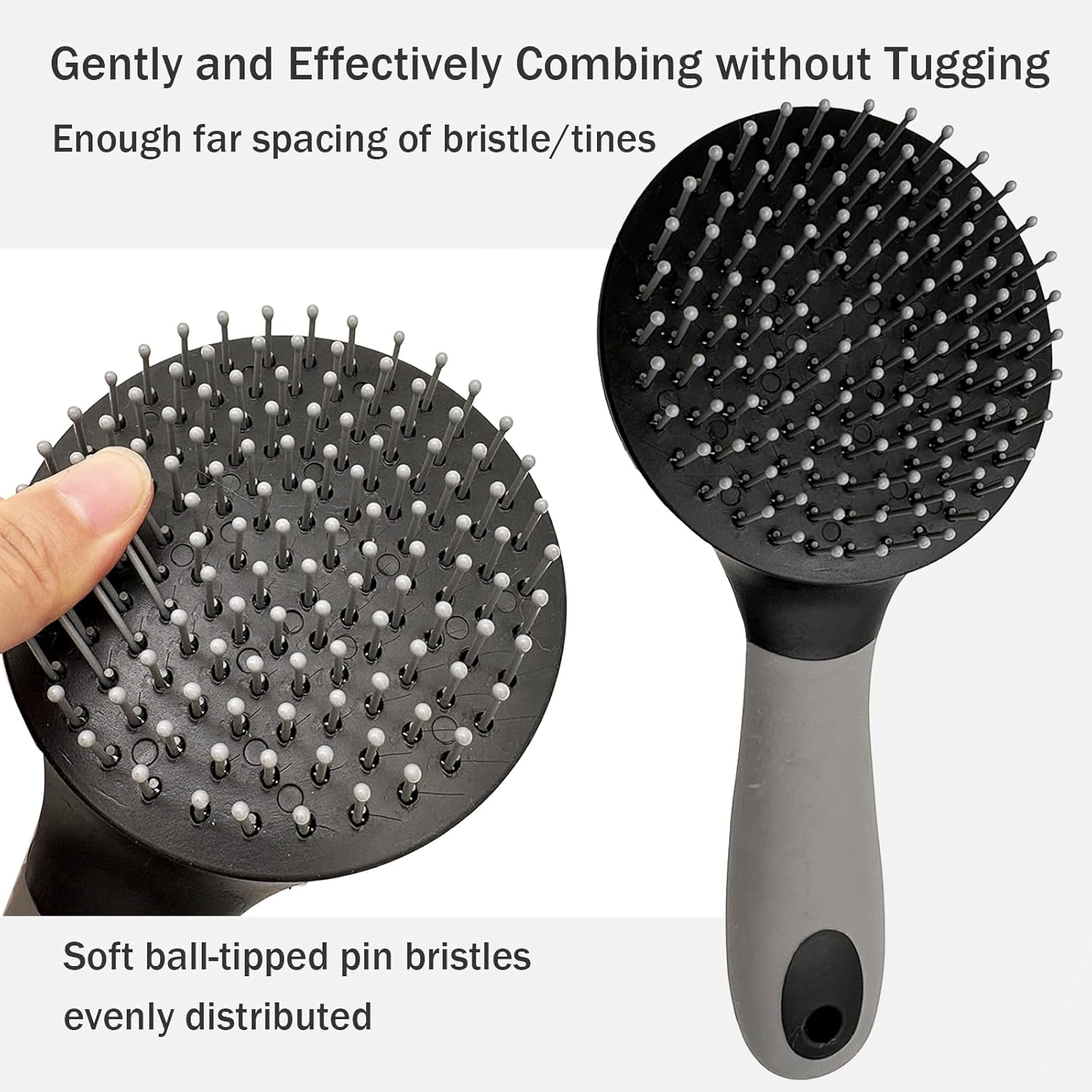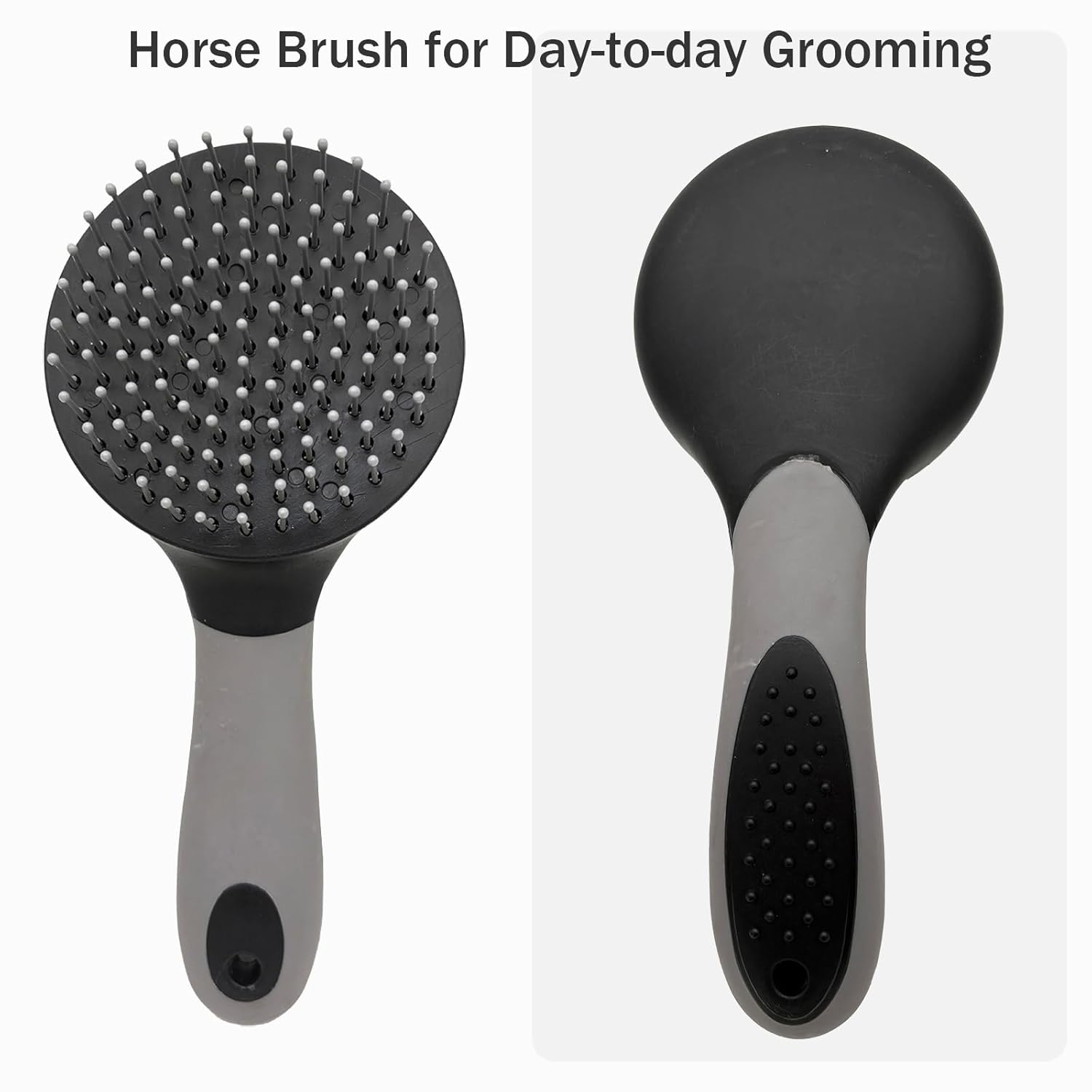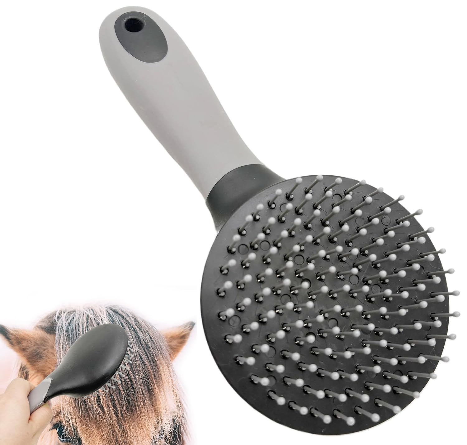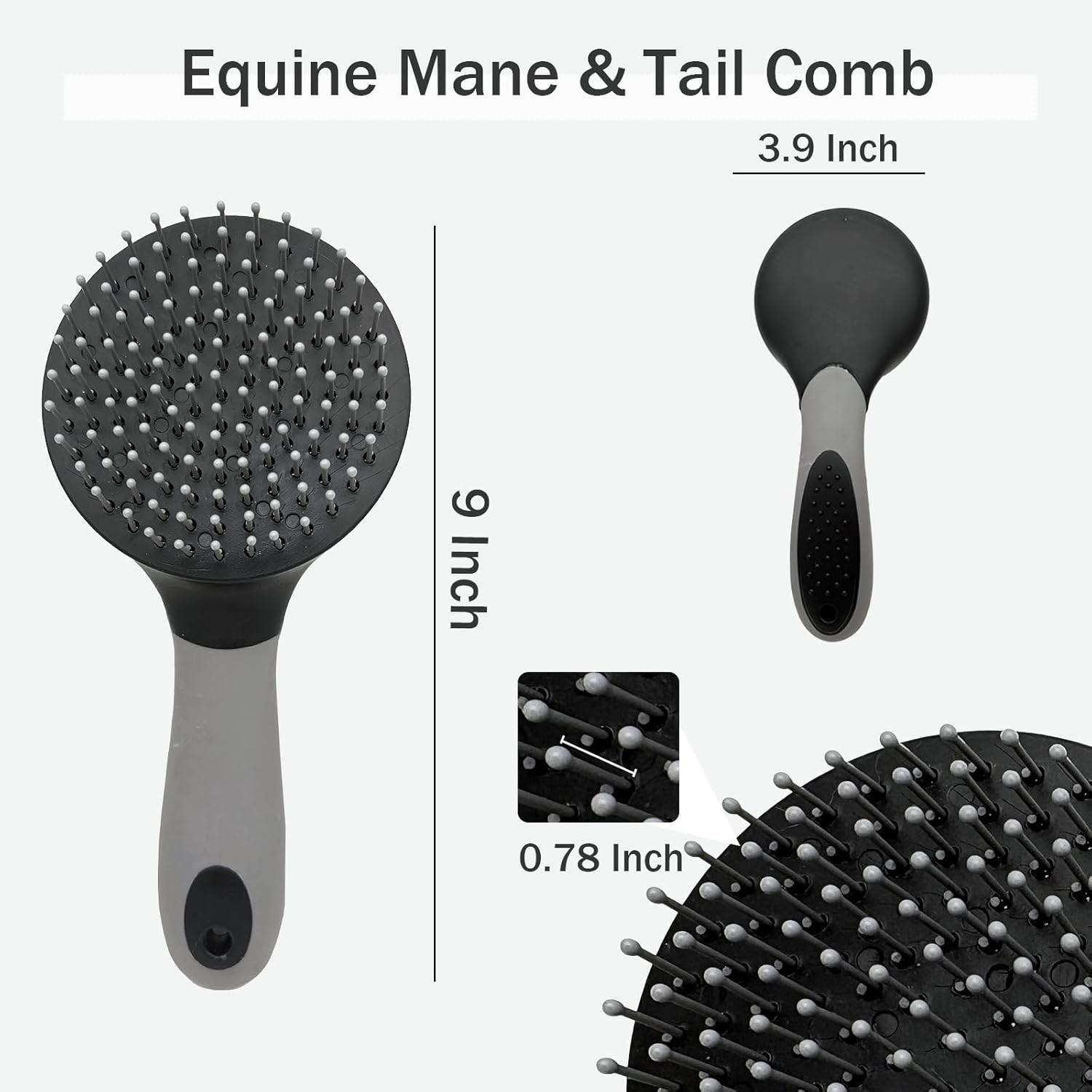 • [Large Round Head Design],This horse mane and tail brush has a large round head with ball-tipped pin bristles,bristles are long and securely set in hard plastic,enough far spacing of bristle/tines, it pulls less than regular brushes,bristles go through the mane and tail easy and thoroughly without snagging.and leaves the tail/mane slick and shiny.convenient tool for day-to-day grooming.