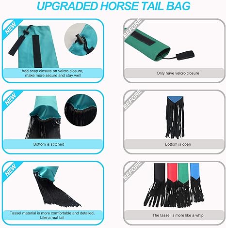 - Easy Application: Upgraded with a large 6-inch entrance, adjustable snaps, and Velcro, our tail bag ensures a quick, snug fit. The stitched bottom makes wrapping simple, keeping the tail secure and protected with minimal effort