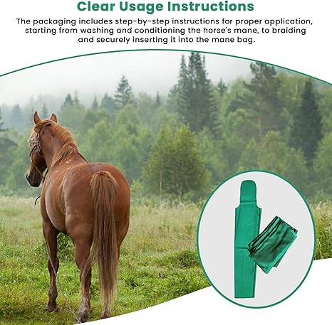 - SIMPLE APPLICATION: The usage instructions are simple and easy to follow. There are no complicated steps involved. After washing and conditioning your horse’s mane, you can easily braid it into 2-3 inch sections, secure it with rubber bands, and then insert the braided mane into the bag. Tie off using the provided straps, repeating the process until the entire mane is safely enclosed.