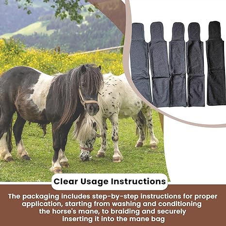 • SIMPLE APPLICATION: The usage instructions are simple and easy to follow. There are no complicated steps involved. After washing and conditioning your horse’s mane, you can easily braid it into 2-3 inch sections, secure it with rubber bands, and then insert the braided mane into the bag. Tie off using the provided straps, repeating the process until the entire mane is safely enclosed.