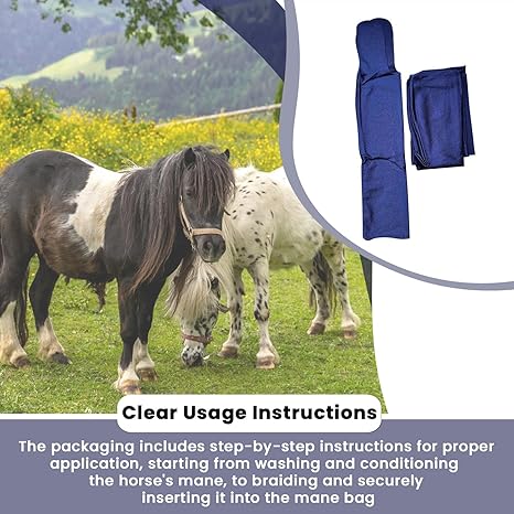 • SIMPLE APPLICATION: The usage instructions are simple and easy to follow. There are no complicated steps involved. After washing and conditioning your horse’s mane, you can easily braid it into 2-3 inch sections, secure it with rubber bands, and then insert the braided mane into the bag. Tie off using the provided straps, repeating the process until the entire mane is safely enclosed.