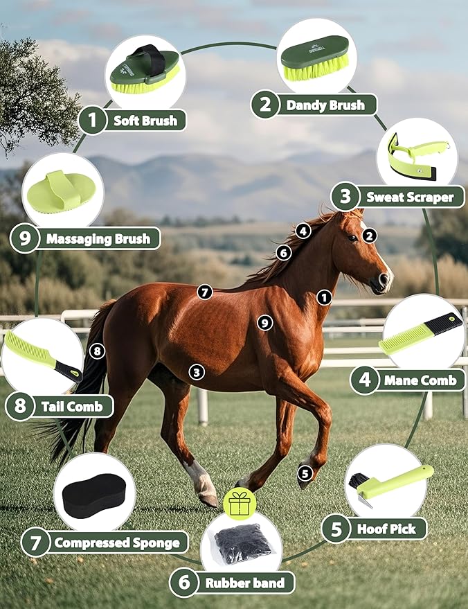 - Complete 9-Piece Kit: Includes all essential grooming tools: dandy brush, soft brush, massaging brush, sweat scraper, hoof pick, mane comb, tail comb, and a compressed sponge—plus a rubber band pack for mane and tail styling.