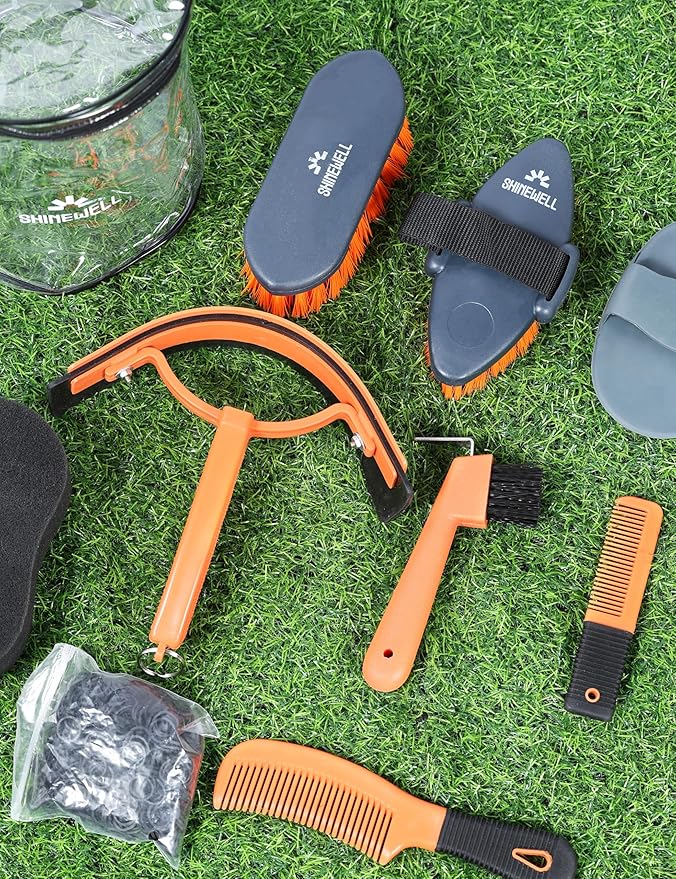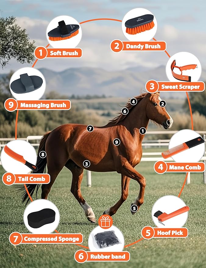 • Complete 9-Piece Kit: Includes all essential grooming tools: dandy brush, soft brush, massaging brush, sweat scraper, hoof pick, mane comb, tail comb, and a compressed sponge—plus a rubber band pack for mane and tail styling.