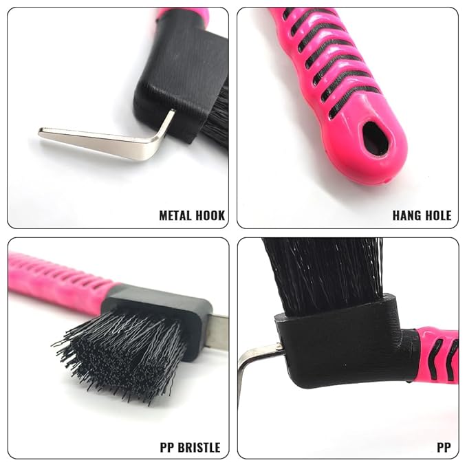 - CONVENIENT FOR STORAGE- The handle of this hoof pick brush features a small aperture, making it easy for us to hang it when not in use, thus saving valuable space.