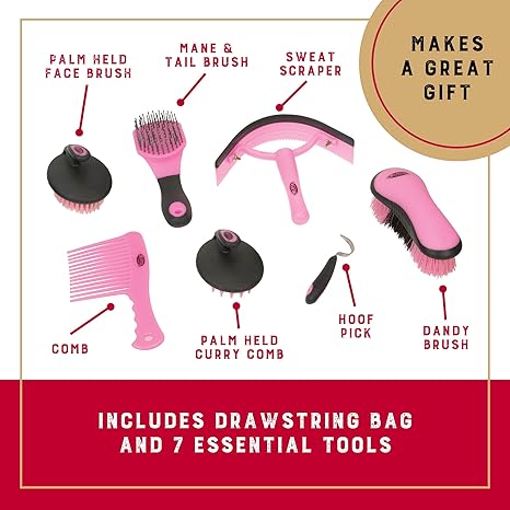 - 7-Piece Grooming Kit: Weaver Equine’s grooming kit for horses meets all your equine grooming needs; the horse care kit includes a comb, hoof pick, palm-held curry comb, face brush, mane and tail brush, dandy brush, and sweat scraper/coarse curry combo